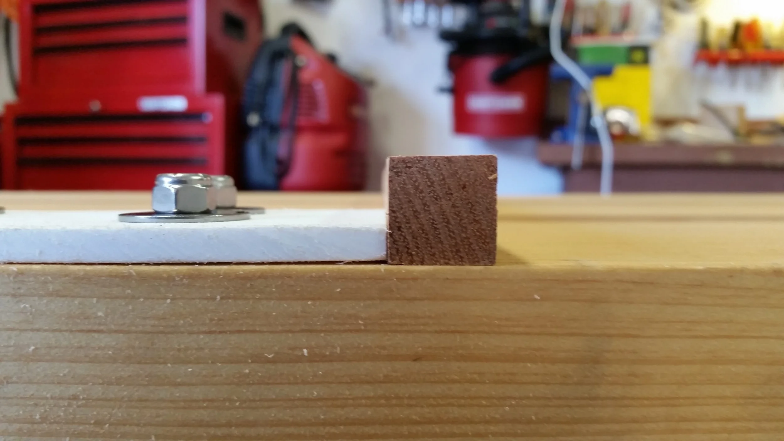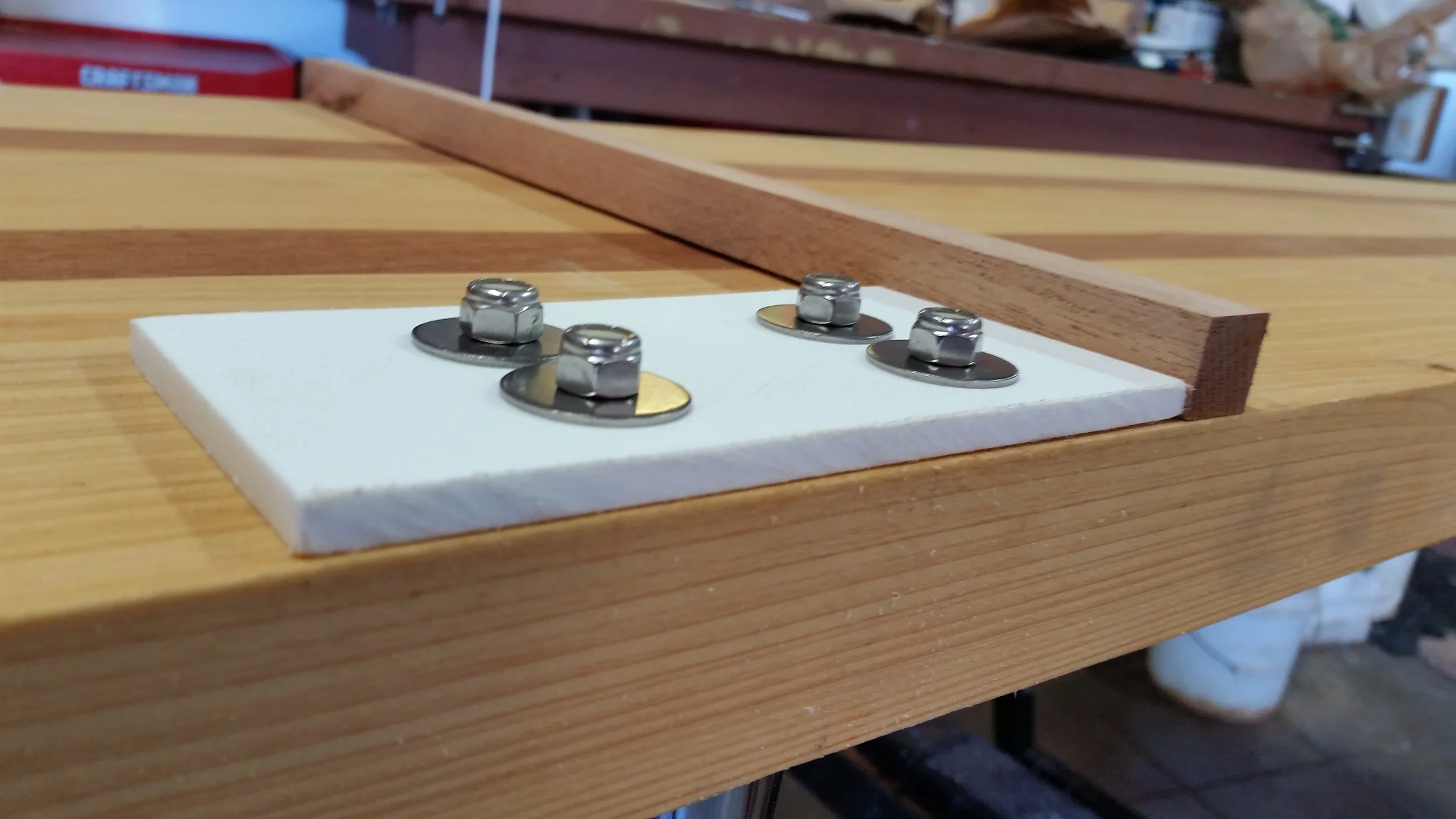 The nuts on the underside could scratch the deck when we carry the gangplank on deck, so additional sticks of mahogany were installed with bronze screws. The sticks are stand more proud than the nuts, protecting the deck from scratches.