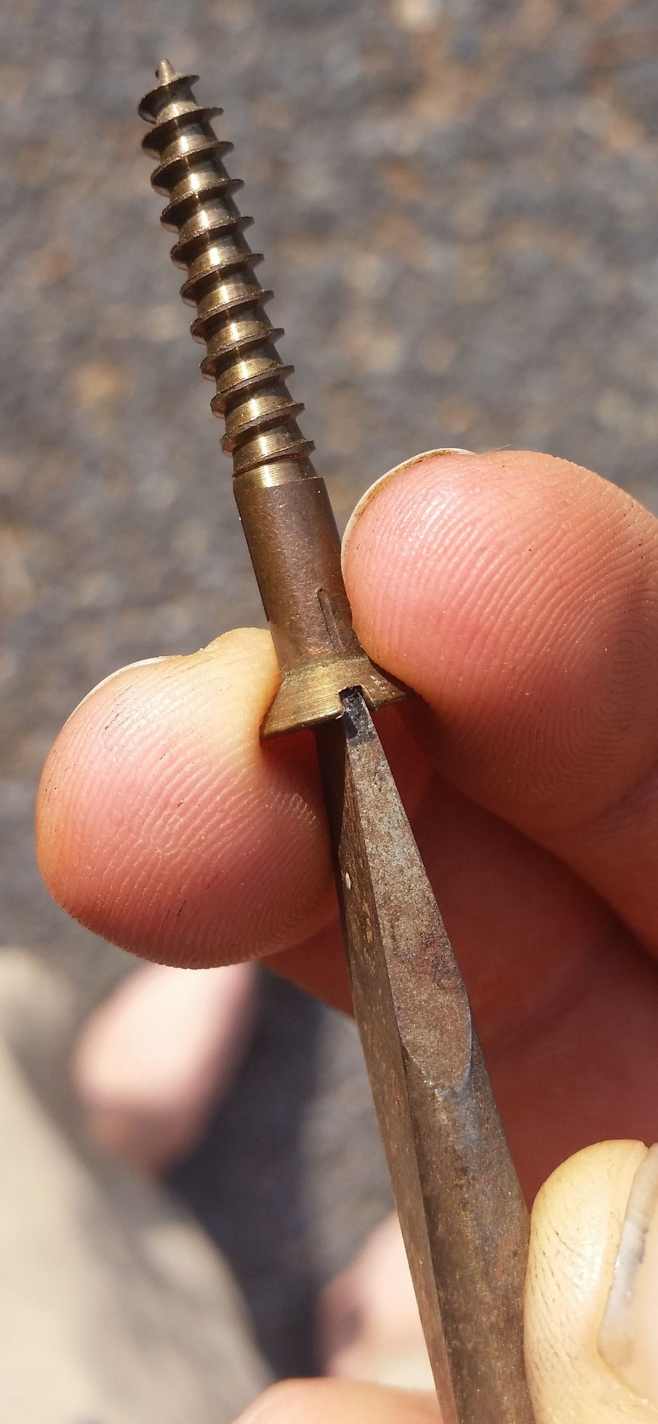 If you use a smaller than adequate screw driver on a bronze screw, you will quickly slip out of the slot and gall up the threads. If the screw driver is too big and doesn't sit into the bottom of the slot, the same will occur. Once the slot has been galled, the sides of the slot will be rounded and it will be even easier for the driver to slip out again, further galling up the head. To avoid any of these problems, you need to make sure that the screw driver reaches the bottom of the slot and there is no gap or void between the bit and the head. If the bit fills the slot perfectly, it will power the screw all the way home without issue. If there is any discrepancy in the fit, it will slip out and gall up the head.