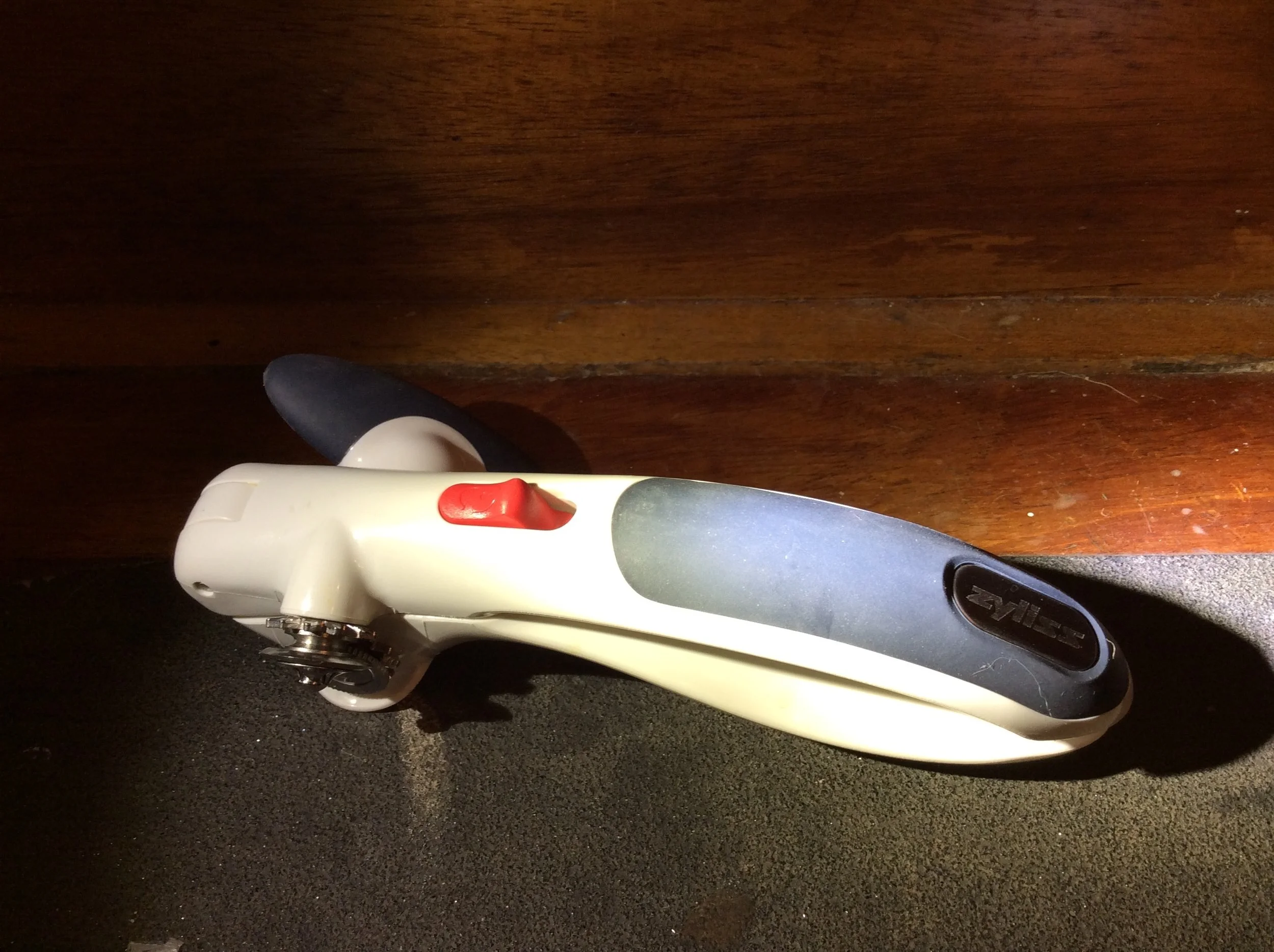 This can opener was a gift from Maddie's parents when they had heard about our can opening strife. This can opener has large and comfortable handles that lock together when operating. To unlock, all you need to do is push the red button.