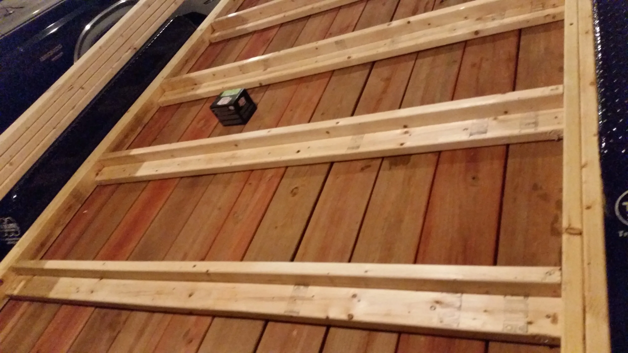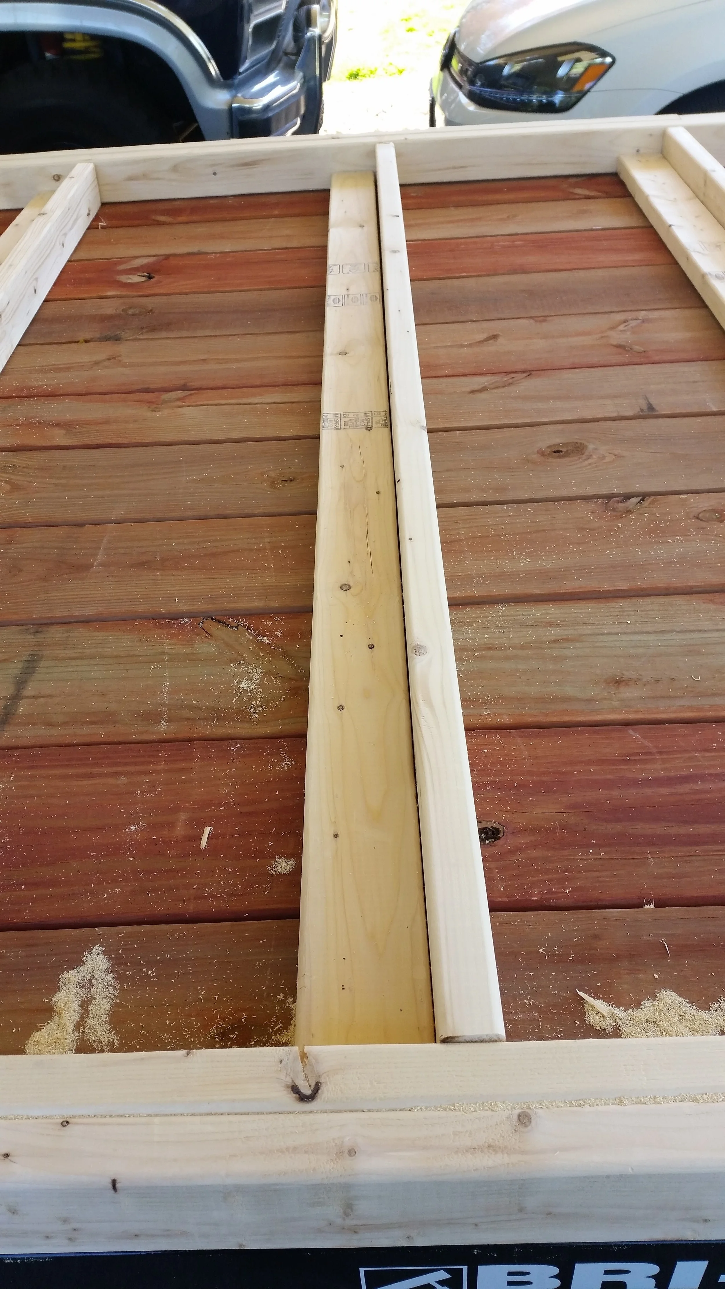 I also set the subfloor 2x4's vertical and horizontal across the middle. The vertical ones are to support the floor, while the horizontal ones are to provide a firm surface to attach the subfloor to the trailer.